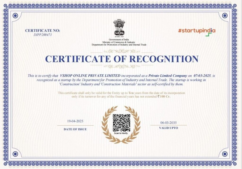 VSHOPONLINE PRIVATE LIMITED has been officially recognized under the Startup India initiative by the Department for Promotion of Industry and Internal Trade (DPIIT). This recognition validates our innovation, growth potential, and contribution to the construction and procurement industry.